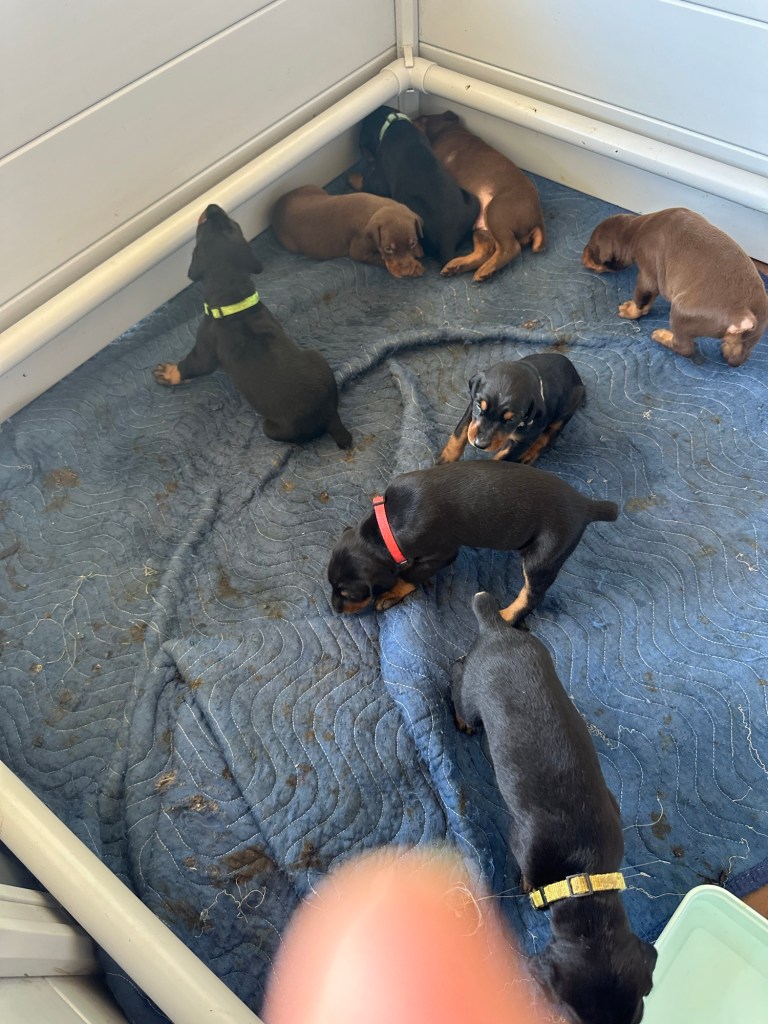 We are loving how each puppy is coming out and showing their own little attitudes. One of the red males thinks he is the boss and isn’t afraid of anything. So nice to watch these little ones grow up. They have started their mush food now and are loving it!